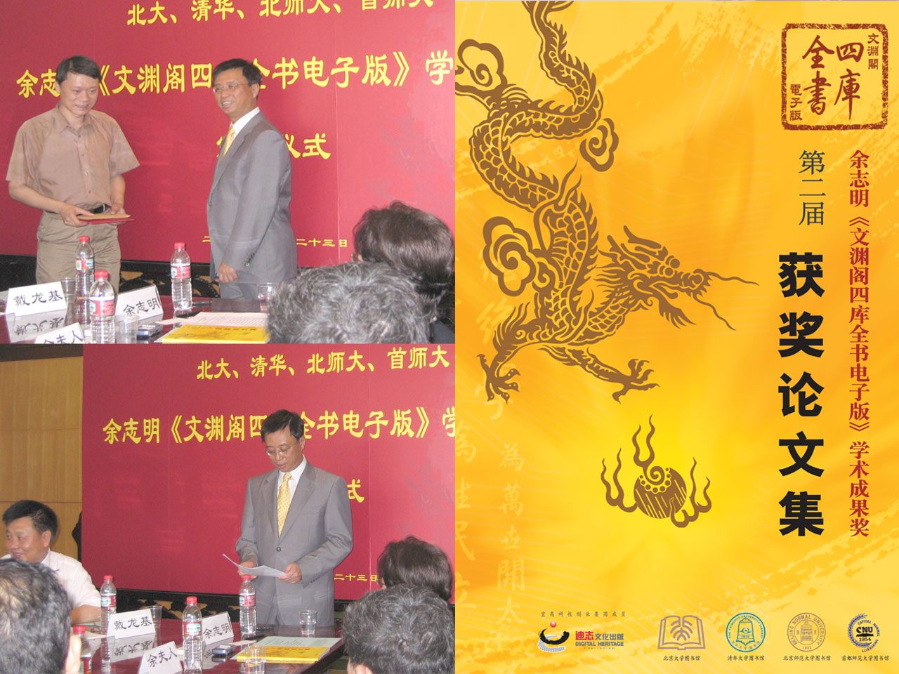 | 第二屆余志明《文淵閣四庫全書電子版》學術成果獎,由北京大學圖書館、清華大學圖書館、北京師範大學圖書館、首都師範大學圖書館首次聯合舉辦,頒獎典禮已於6月23日上午,在北京大學圖書館新館會議室隆重舉行。迪志文化出版有限公司主席余志明先生親自頒獎,總共頒發十二個獎項:一個「專著一等獎」、三個「專著二等獎」、四個「專著三等獎」、四個「論文一等獎」,各得獎名單詳列如下:<table width=100% c ... |