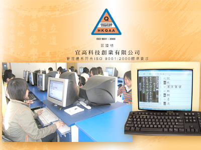 | 香港宜高科技創業有限公司繼2003年資訊科技部考獲ISO 9001:2000證書後,於去年籌劃將認證範圍擴大至產品發展部。產品發展部是新成立的部門,專門負責四庫電子版項目的發展計劃,於今年1月亦成功通過香港品質保證局的考核,取得ISO 9001:2000證書。