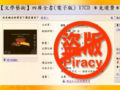 | 香港迪志文化出版有限公司早前控告台灣不法份子,在網上售賣盜版的《文淵閣四庫全書電子版》光碟,成功獲得勝訴,被告於八月二十四日在台灣台北地方法院檢察署偵查庭中當庭認罪,承認侵犯著作權益。被告其後要求與本公司庭外和解,並願意在台灣兩大報紙(聯合報及中國時報)全國版之頭版刊登道歉啟事一天及賠償30萬元新台幣。本公司鑑於被告的和解條件甚有誠意,亦符合法院預期,決定接受對方的和解條件。對於侵權盜版的違法行為 ... |