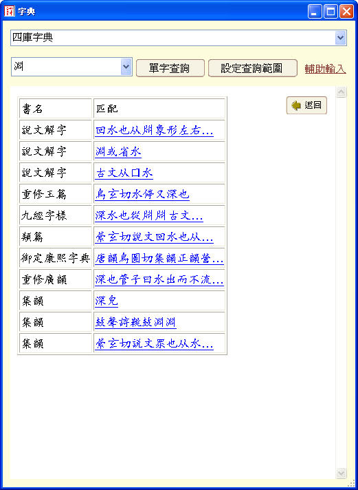 《文淵閣四庫全書電子版》3.0版繼早前推出《說文解字》、《重修廣韻》、《御定康熙字典》、《重修玉篇》、《集韻》、《九經字樣》和《五經文字》後,最近再增加了《類篇》這本字典。《類篇》相傳為宋司馬光所撰,書中依照《說文解字》的體例和編次,收錄字頭連重文共53165字,其中不少是唐宋間產生的文字,乃是研究文字發展的寶貴資料。 當讀者使用四庫電子版遇到不明白的文字時,可以利用字典功能,透過上述的字典,便 ...