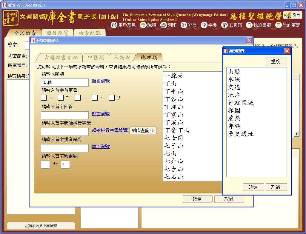 | 《文淵閣四庫全書電子版》3.0版繼推出中醫類和人物類詞條後,即將新增另一個類別詞條──地理類,當中包括《四庫全書》收錄的首字筆劃為一至四劃(依簡體筆劃計算) 約8500條的地理詞條,並歸納為山脈、水域、地名、建築、邦國、行政區域、交通等多個類別,讀者可以利用此分類方法檢索相關詞條。另外,我們還提供了按傳統筆形排序和按漢語拼音排序這兩種簡便易用的檢索模式,即使不懂中文輸入法的用戶,也可以利用傳統筆形 ... |